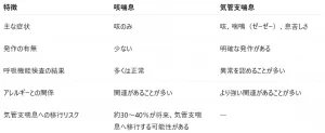 以下に気管支喘息と咳喘息の違いについてまとめた表を載せますのでご参照ください。
